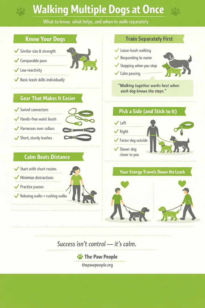 Walking multiple dogs can be safe and enjoyable, but only if a few key conditions are in place. Otherwise, it’s often better (and safer) to walk them separately.